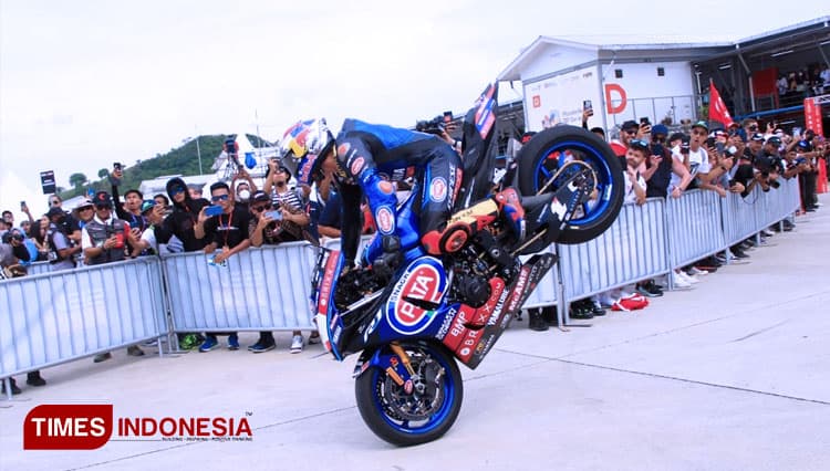 TIMES Mahakam/Pembalap PATA Yamaha Brixx Toprak Razgatlioglu melakukan atraksi stopie ban depan usai memenangi race 1 WSBK Mandalika 2022, Sabtu (12/11/2022). (FOTO: Tria Adha/TIMES Indonesia).