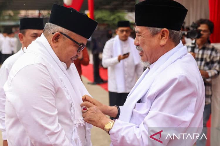 TIMES Mahakam/Pimpinan pesantren Insafuddin Banda Aceh memberikan kain kepada Sekda Aceh Bustami Hamzah usai peringati Hari Santri, di Banda Aceh, Selasa (24/10/2023). (FOTO: ANTARA/HO/Humas Pemprov Aceh)
