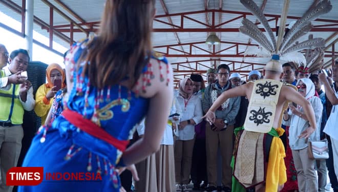 TIMES Mahakam/Cawapres Nomor urut 02, Sandiaga Salahuddin Uno disambut dengan upacara adat Tetek Pantan saat tiba di Bandara Tjilik Riwut Palangkaraya, Kalimantan, Senin (04/02/2019). (FOTO: Tofik For TIMES Indonesia)